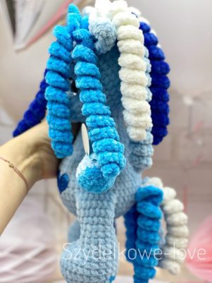 Jednorożec- w niebieskim kolorze, wykonany ręcznie, z certyfikowanej hipoalergicznej włóczki dla dzieci.
