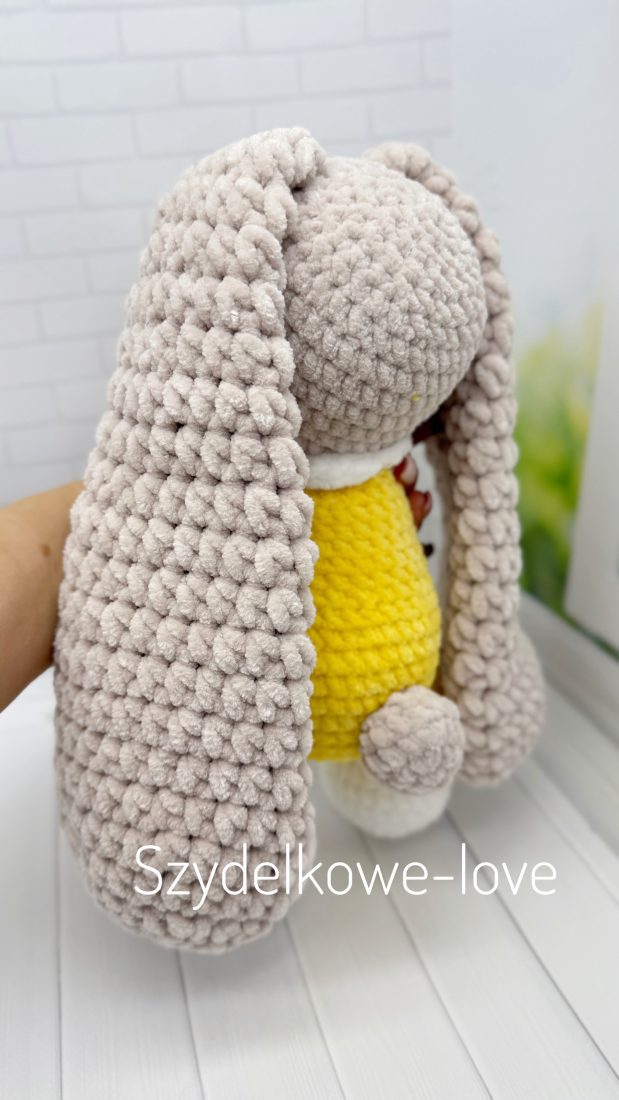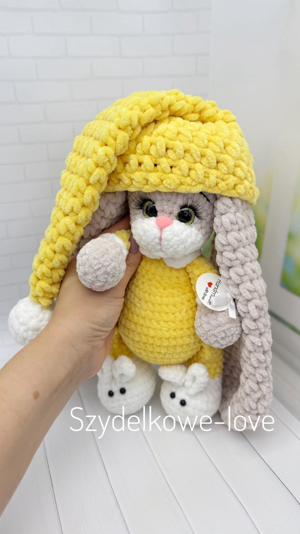 Królik w żółtej czapeczce i w białych bucikach Wykonane ręcznie, z certyfikowanej hipoalergicznej włóczki dla dzieci.