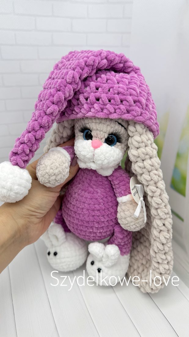 Królik w czapeczce i bucikach wykonany szydełkiem