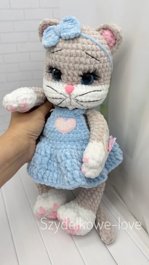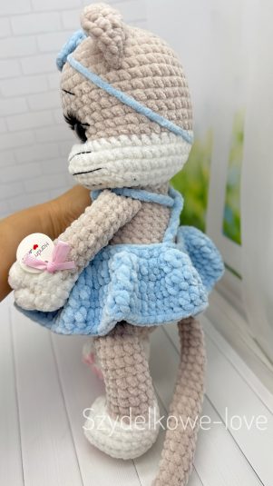 Kotek niebieskiej sukience z Różą serduszkiem Wykonany ręcznie, z certyfikowanej hipoalergicznej włóczki dla dzieci.